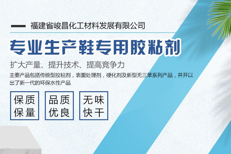 福建省峻昌化工材料發展有限公司總部設在中國鞋鄉——晉江。為更好、更方便服務廣大客戶,我司在廣東江門及福建均設有先進的PU膠生產基地,歡迎廣大同行前來我司灌裝或批發銷售。公司是一家中外合資,面向亞太地區從事研究,生產銷售鞋用粘膠10多年的專業公司。從國外引進生產能力為數萬噸的全套先進生產,檢驗設備,與德國Bayer,日本DENKA及美國,西班牙等其它海外公司有著密切的原材料及技術合作。公司主要產品包括傳統型膠粘劑,表面處理劑,硬化劑及新型無三苯系列產品,并開以出了新一代的環保水性產品。供應國內外鞋業,手提箱包及建筑工程單位使用。公司始終保持產品的良好品質及專業特性,并倍受廣大客戶好評。